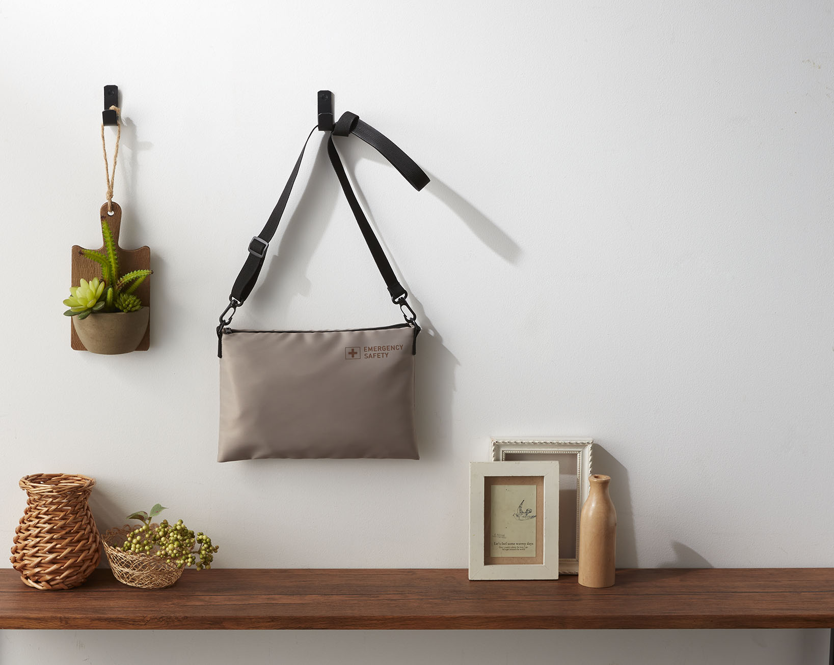 地震発生・災害非常時に、直ぐに取り出し、肩に携えるサコッシュタイプのポーチに最小限の避難グッズをセット。B5サイズパッケージ入りでコンパクトに収納!